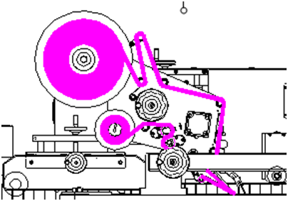 2. 按圖示出標方向,把標簽料卷裝入,再把三角形料盤套上并裝好扭緊;
